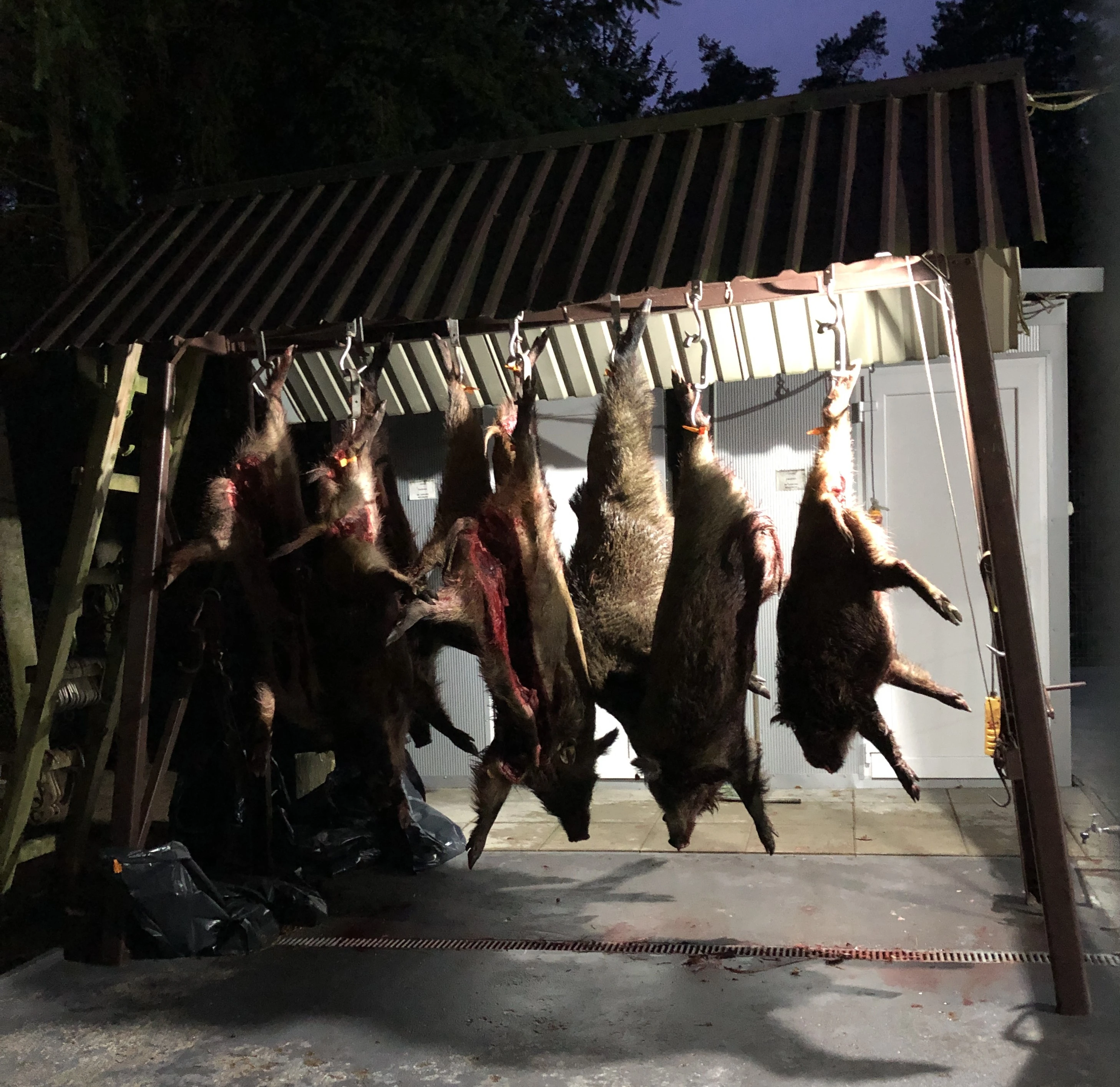 Voor de varkens was een speciale afdeling gemaakt, apart van de normale koelcel. Met een betonnen vloer met gekanaliseerde afvoer van water etc. en alles binnen een stalen hek, ontoegankelijk voor ander wild en onbevoegden.