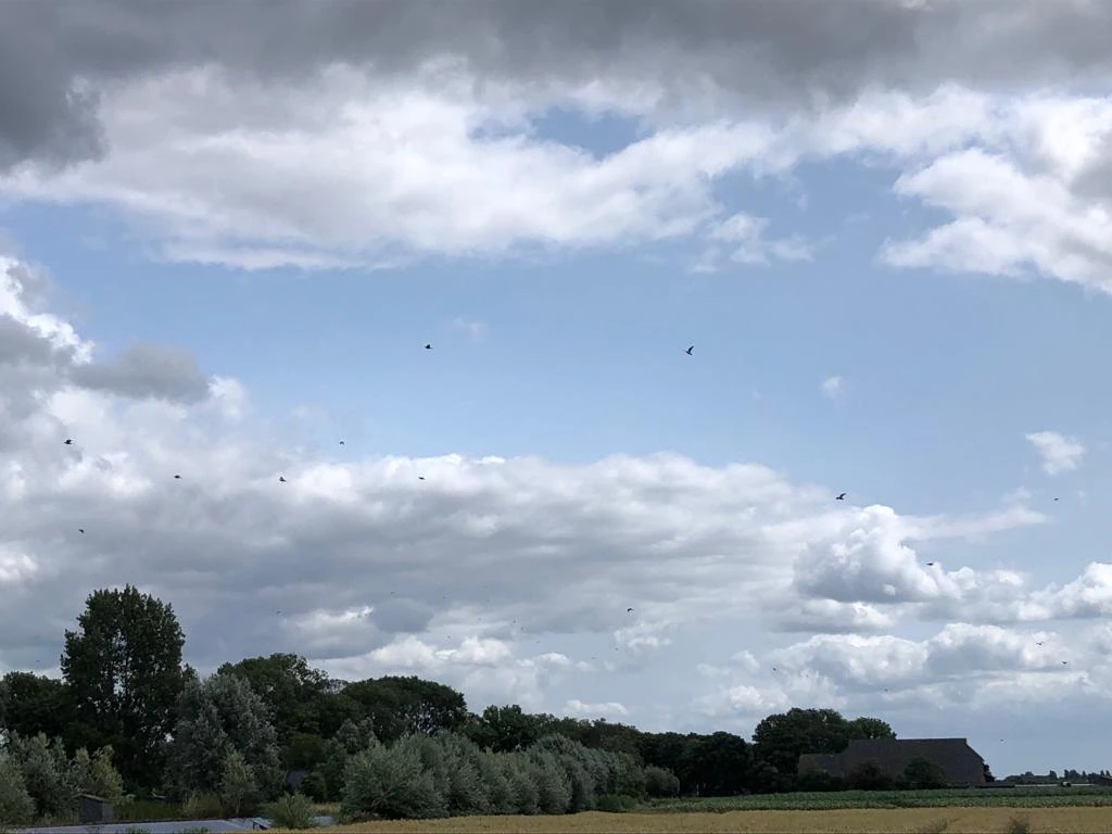 Dan, opeens, is het afgelopen, ruim een uur zien we -bijna- geen duiven meer. Ik vraag de gasten wat ze willen, want we zouden nu kunnen gaan eten en daarna nog een uurtje gaan zitten. Dat besluiten we te doen en we verzamelen weer bij de boerderij. Daar staan we met wat fris eerst nog wat na te praten. En er gebeurt wat elke jager wel herkend: dan vliegt het wild over je hoofd. Het is alsof ze dan weten dat de geweren in de foedralen zitten.