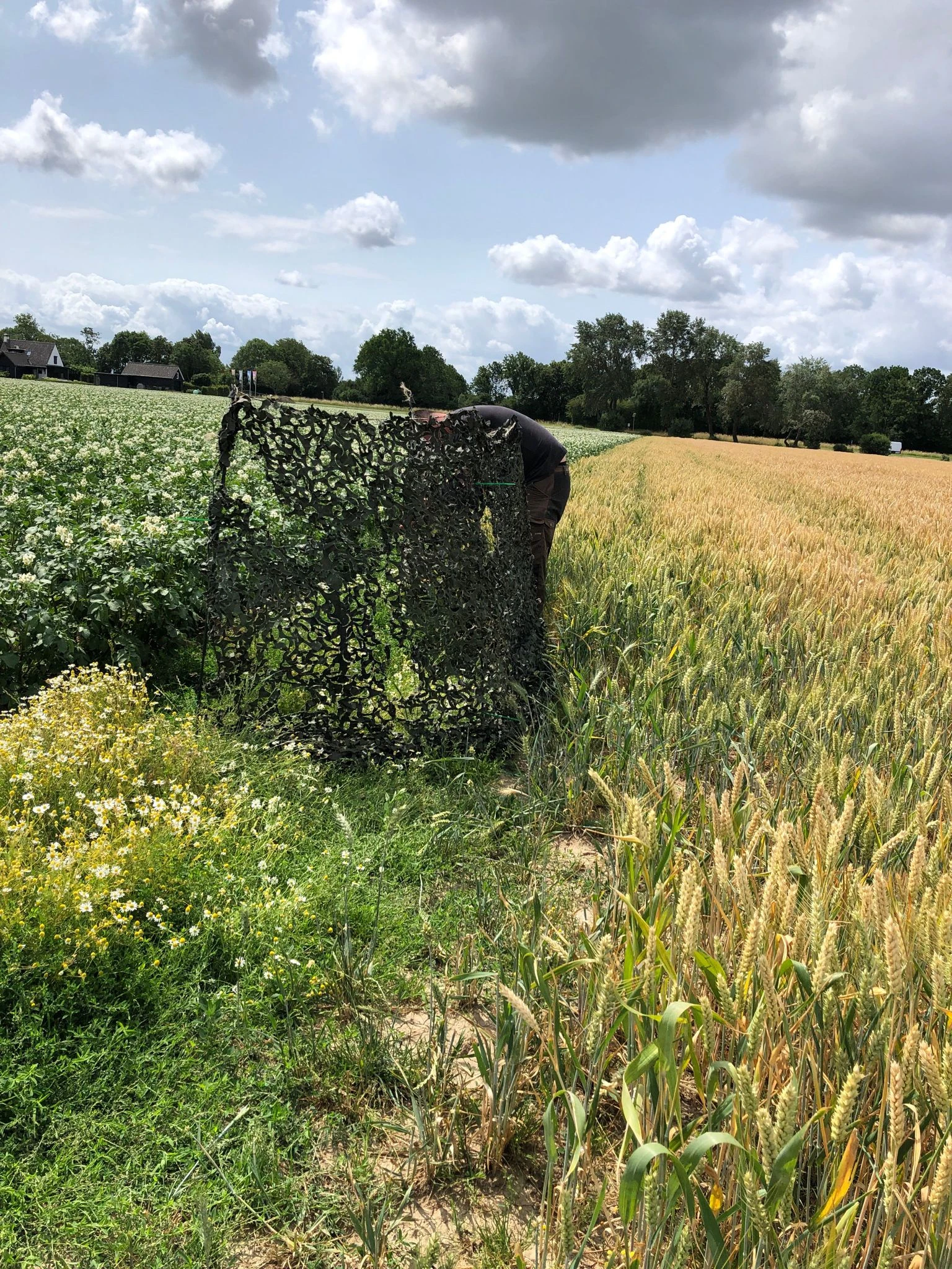 Samen met S. kijk ik waar de trek van de houtduiven op het graan is en daar maken we vast de hutjes van waaruit we morgen zullen jagen. En de duiventrek is niet zomaar een beetje aan- en afvliegen. Nee, tijdens het opzetten van de hutjes vallen de duiven gewoon op korte afstand van ons in. Soms schrikken ze, vliegen op, maar komen bijna direct weer terug. Dat belooft veel voor morgen, als Z. en G. samen met ons op pad gaan.