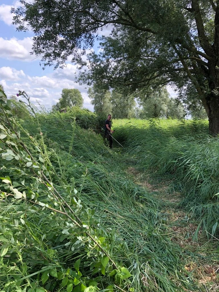 Zo lopen we met de bosmaaier paden vrij te maken van de bramen en hoog opgeschoten riet, knippen uitlopers van struiken om de hutjes die schoten zullen kunnen belemmeren en vlechten wat matjes dicht met de geknipte twijgen.
