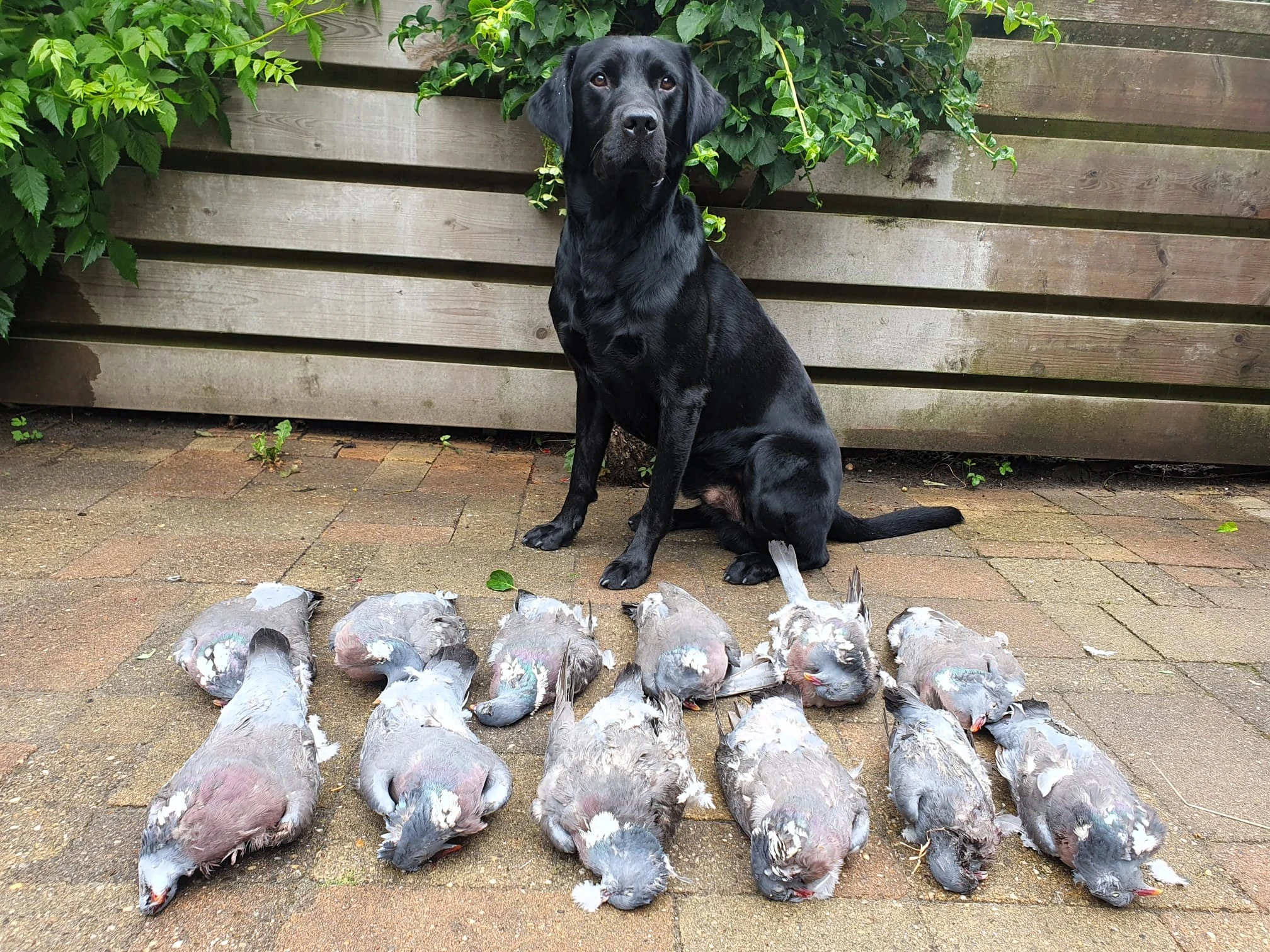 “Pak je geweer”, zeg ik. Nou hoef ik dat tegen S. niet te zeggen. Hij komt niet uit een jagersmilieu, maar heeft bij een bloedtransfusie kennelijk ook een scheut ‘stropers’bloed meegekregen. Hij staat al klaar in afwachting van de volgende duiven daar. Z. heeft nog een (kleine) aansporing nodig maar is ook gereed. G. focust zich op zijn hondje, prima actie is dat. Als je je leven lang als jager plezier van je hondje wil hebben kan het geen kwaad in deze fase meer aandacht voor je hond, dan voor het schot te hebben.