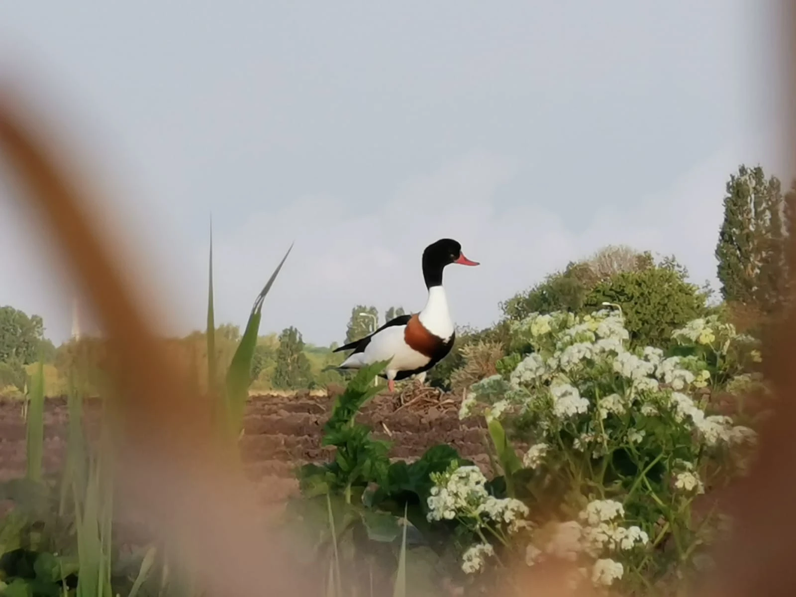 Twee bergeenden landen dicht bij mijn hutje, het mannetje komt recht op mij aflopen, maar vertrouwt het kennelijk toch niet. Als snel besluit hij, gevolgd door het vrouwtje, om weer te vertrekken.