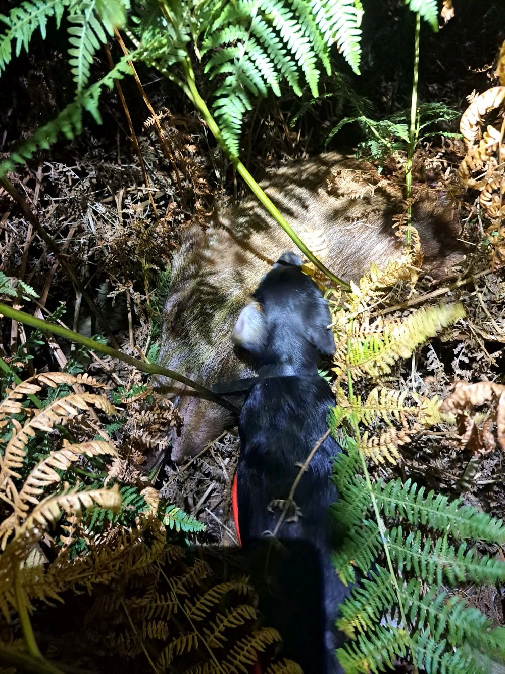 Sefke moet eraan te pas komen en als je hem ziet nazoeken, denk je aan een jonge hond. Ik geniet, maar als ik dichterbij kom besef ik, dat het een vertekend beeld is. Zijn ogen tonen staar. Gek dat je dat in je hoofdlamp beter ziet dan bij daglicht. Ook reageert hij niet meer, als ik hem zeg, dat het goed is en dat hij het varken los kan laten. Pas bij aanraking reageert hij.